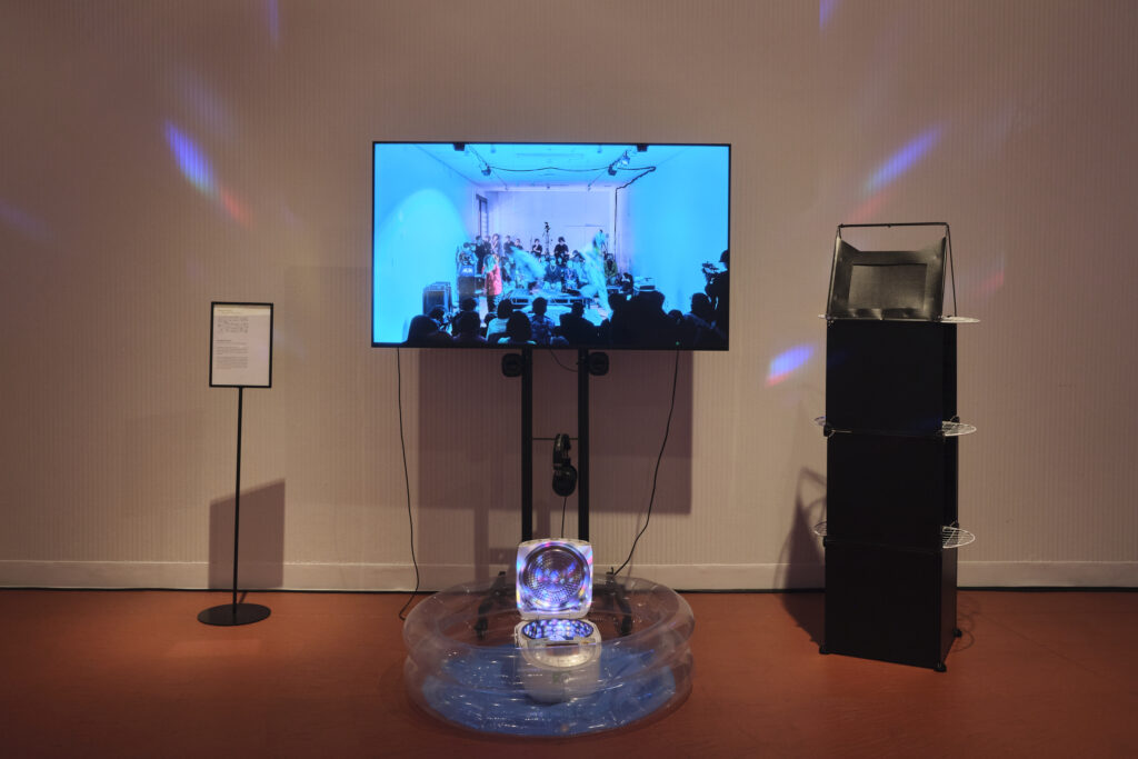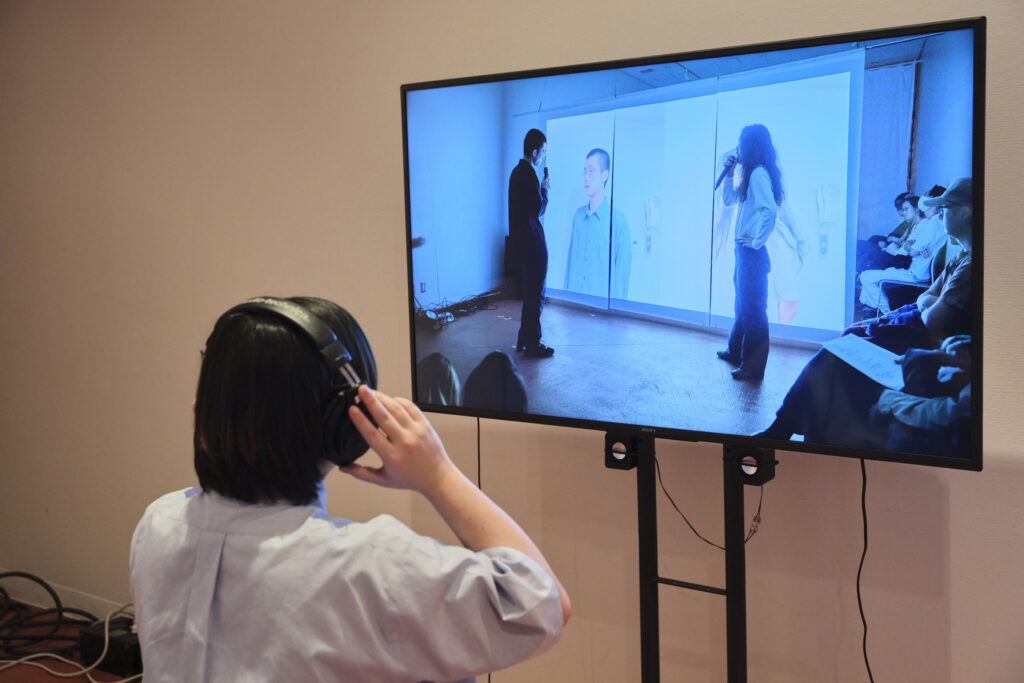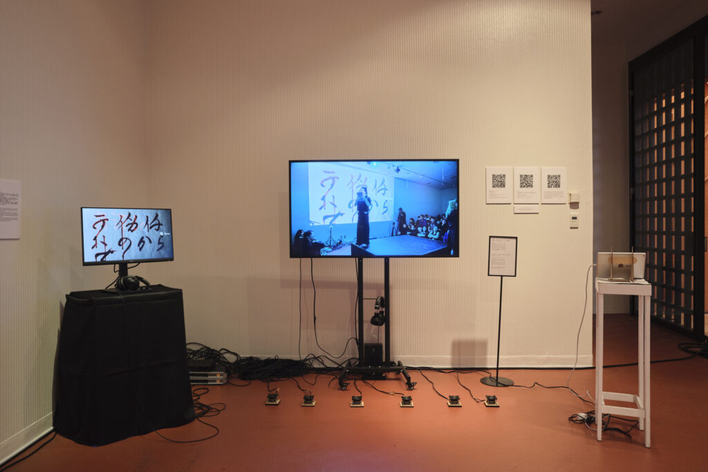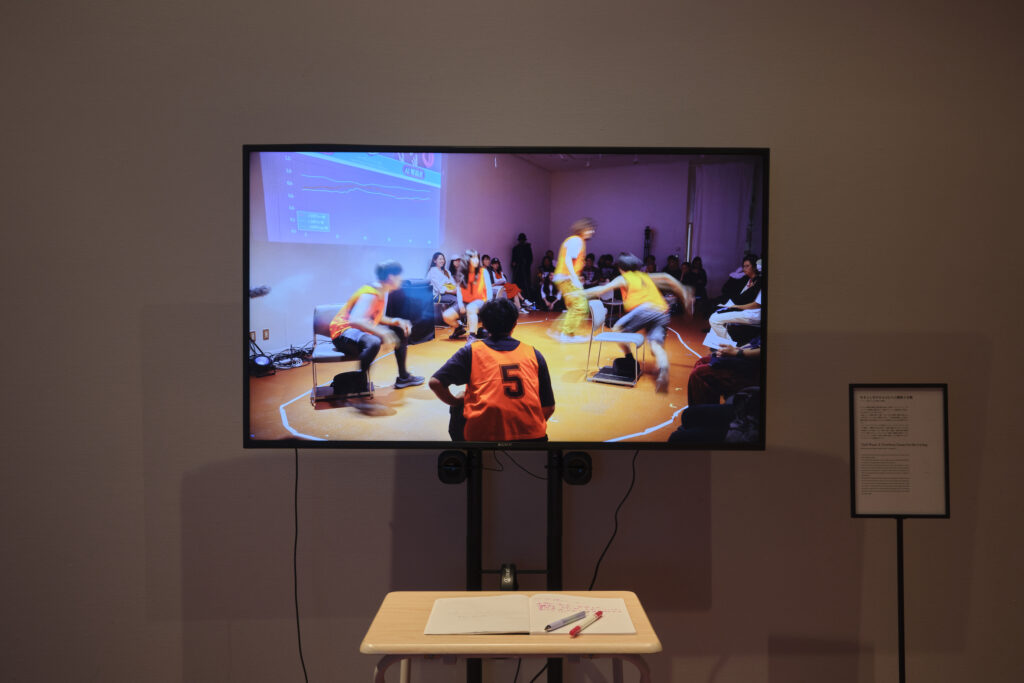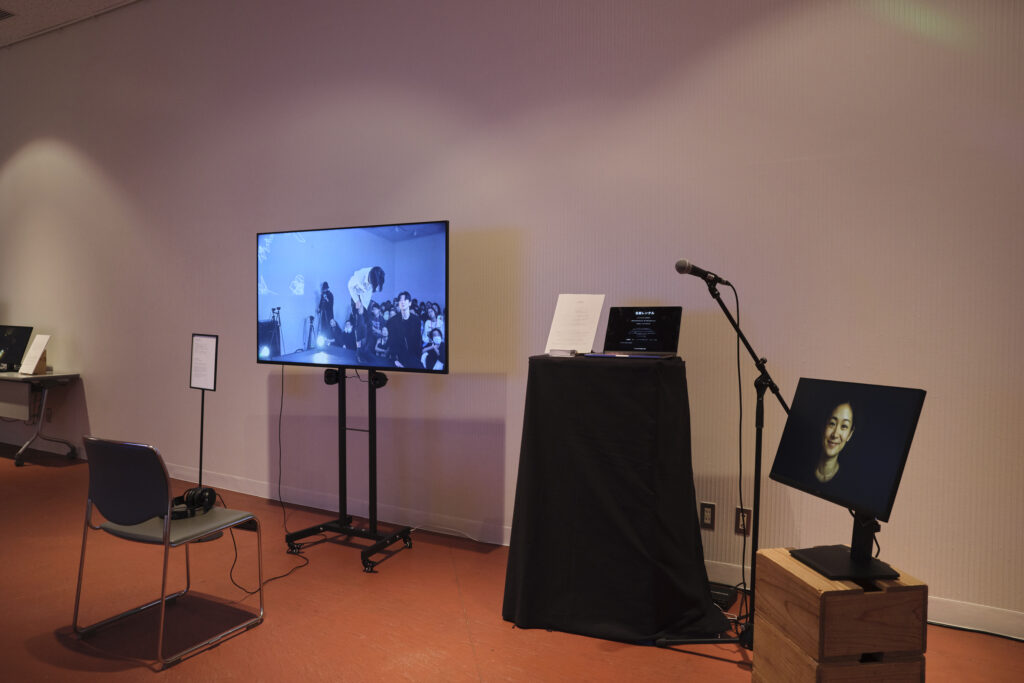 さらに、ウェアラブルデバイスで読み取ったパフォーマーのバイタルデータをAIが解析し、即興的に実況を生成する。演算は正確でありながら、出力される言葉はどこか不正確で、しばしば笑いを誘う。同時に、通常の実況が想像のうえでしか触れられなかったプレイヤーの〈内側〉を直接的に参照しているため、AIによるこの実況は、表面上は素朴な実況らしさの再現でありながら、どこかグロテスクな質感を帯びている。