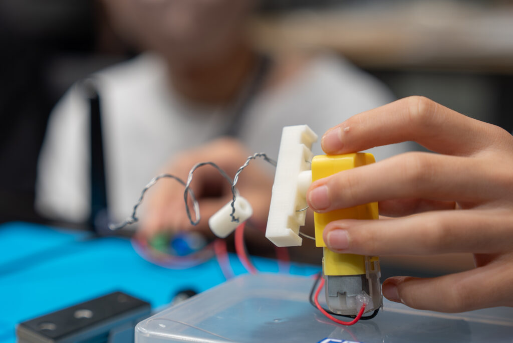 動きをつくるための機械的な構造や、モーターの速度や回転のパターンを制御するためのプログラミングを学び、個性的な動きの表現に挑戦する講座。技術の得意な点、不得意な点を考えながら、適切な技術を採用していくことを体験します。