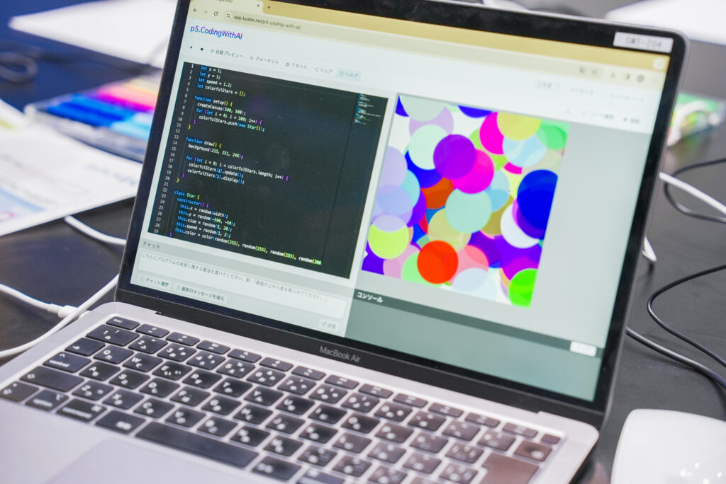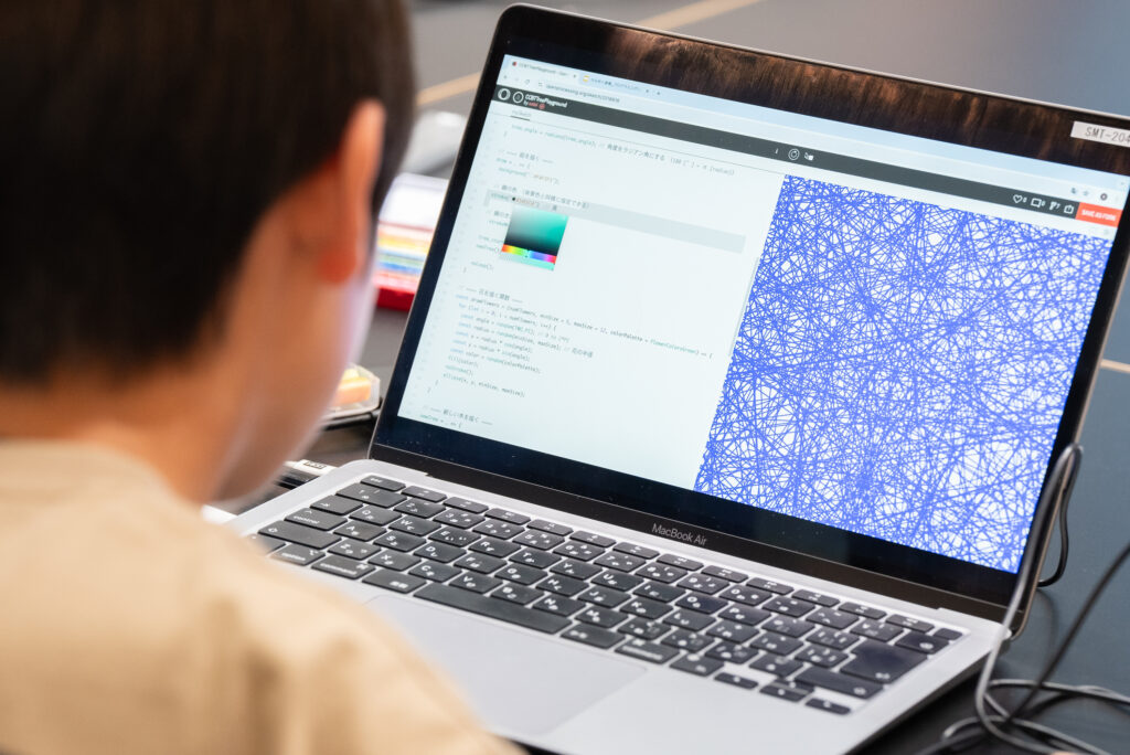 生成AIを使って表現を生み出す方法を学ぶ講座。大量のデータや情報を学習し新しいデータを作り出す技術である生成AIの得意・不得意を理解し、プログラミングを通じてパソコン上で動くアニメーションを描画します。