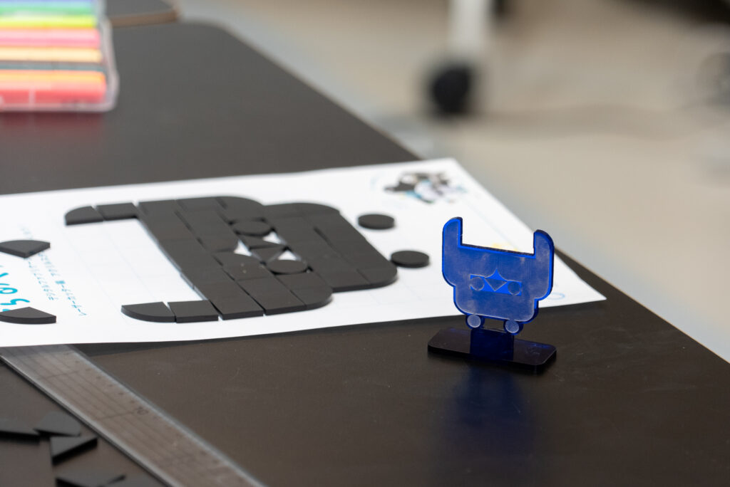 アルゴリズムデザインの基礎と、レーザーカッターの活用方法を学ぶ講座。CCBTのロゴに採用されている、シンプルな図形の組み合わせによってオリジナルの絵柄を作成するシステムを活用し、アクリルスタンドを制作します。