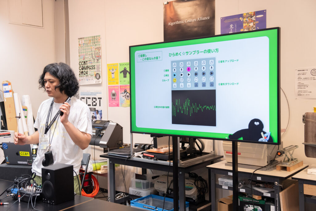 「ひらめく☆道場」は、アート&テクノロジーとの出会いを通じて、ものづくりの方法や楽しさを発見するきっかけを提供する、様々な分野のクリエイターとCCBTのスタッフが開発したオリジナルのワークショップシリーズです。CCBTの設備「テックラボ」にあるファブリケーション機器を活用した電子工作をはじめ、プログラミングやデザイン、映像、音響などのデジタルクリエイティブの基本を学ぶことができます。2023年7月の開講以来、毎月異なるテーマで開催しており、2025年3月までに全10テーマのワークショップが開発・実施されました。