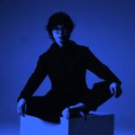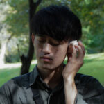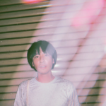 ヘッドホンを着けた若い男性が、歪んだ効果がかかった写真で写っている。背景には本棚があり、男性のシャツには赤い文字がデザインされている。