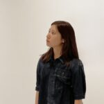 ショートヘアの女性が横を向いて立っている。女性は薄い緑色のジャケットを着ており、背景には大理石の壁と車が見える。
