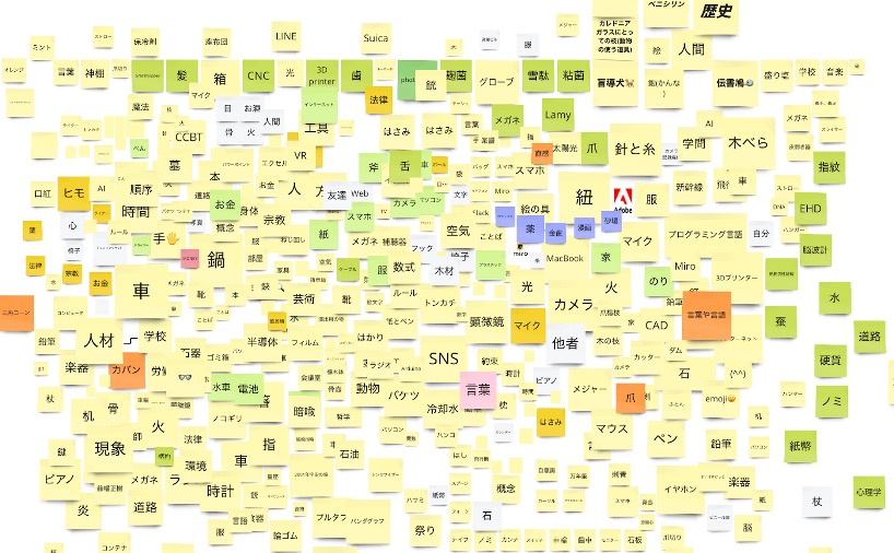 Miro上には紐やメジャーなどいかにも道具といったものから酒など直感的に道具とはみなしにくいもの、歴史や現象などの抽象的な概念までが挙げられた。このように未整理の言葉の集合を分類して、道具というものを抽象的にとらえること。このことを巡って様々な思想家の議論を逍遥すること。これが本Meetup第2回の取り組みだ。