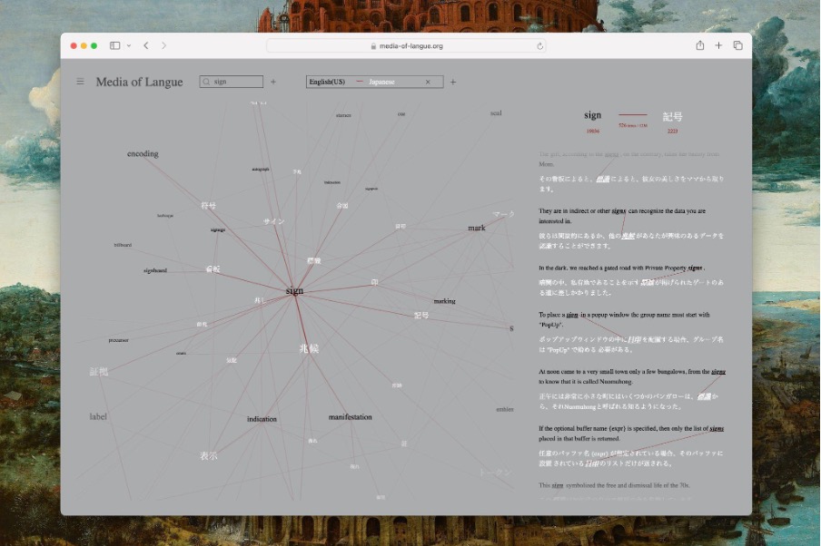 ここで村本剛毅によるオンラインのプロジェクト《Media of Langue》(図2)が参照された。このウェブサイト上では単語を検索すると、その単語の翻訳語、その翻訳語の翻訳語、その翻訳語の翻訳語の翻訳語…が次々と表示され、そのネットワークがビジュアライズされる。しかし藤幡はこれがいわゆる「辞書」ではないことを強調する。これは過去に実際に行われた無数の翻訳を数えあげることのみによって形成される結果としての地図であるからだ。