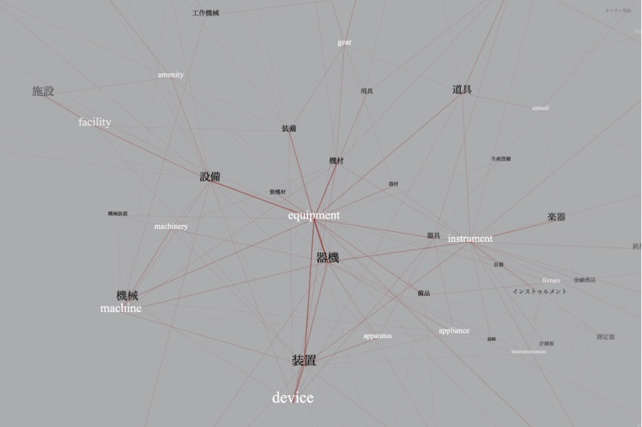 さてMedia of Langue上で「道具」を英語に変換すると例えばtool、instruments、equipment、apparatusなどが表示される。Toolは非常に広い範囲をカバーする単語である。これに対して①instrumentsは使用する人間の身体に近い器具を示す。例えば楽器(musical instruments)は人がそれを使って音を演奏し、鑑賞者はそれを聴くが、これは演奏者がいないと機能しない。②equipmentは「機器」といったニュアンスで、人間がいなくても機能を果たす自律的なものだ。Media of Langue上で①②の位置関係を確認すると、同じ道具という単語の訳でありながら用法としてはほとんどオーバーラップしないことが分かる。さらにApparatusはフランス語圏ではappareil となるのだが、これは「カメラ」という、道具とは全く異なる意味にも繋がる。