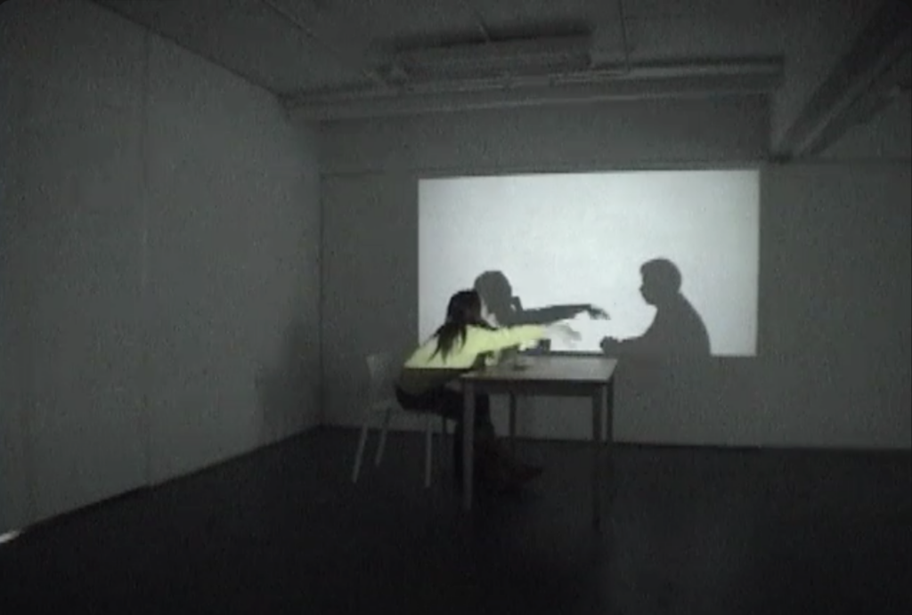 ここで藤幡自身の作品《Portray the Silhouette》(2006、図11)16が参照された。これはプロジェクターによって投影される録画した影の映像と、プロジェクターによってリアルタイムに作り出される影が同じスクリーンに投影されることで、同じ空間・時間にいるかのように感じられる、というものだ。もともとヴァーチャル・リアリティへの批判を背景に作られたというこの作品が表すのは、ヴァーチャル・リアリティの技術によって視覚的に再現された3Dの人物像よりも、影という身近なインデックスを通して私たちの脳が作り出すイリュージョンのほうが、その実在をより強く感じさせるということだ。ここでは、インデックスとしての影のはたらきが強調され、実体のない影だけでも鑑賞者はインタラクションしてしまうというわけだ。いわゆるインタラクティブに振る舞うだけの作品に対する批判にもなっている。これは、ルネサンス絵画とは異なる方向性だが、視覚表現のなかで、このように影について拡張して考えることもできるという例だ。